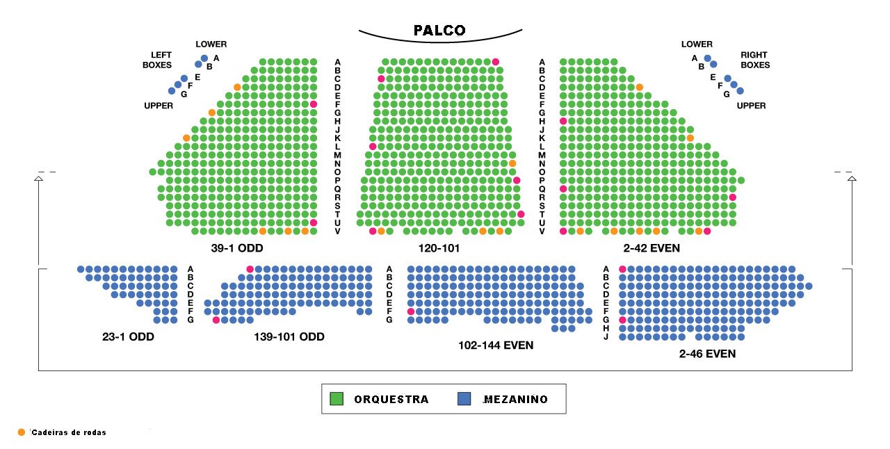 Os teatros em Nova York estão divididos nas seguintes seções: ORQUESTRA, que cobre todo o piso, e são, geralmente, considerados como os melhores lugares disponíveis no teatro. MEZANINO está por trás Orquestra, ou em uma varanda acima dos assentos da Orquestra. Mezanino é frequentemente dividido em Mezanino da FRENTE, considerados como os melhores lugares disponíveis no teatro junto com a Orquestra, e Mezanino POSTERIOR ou BALCONY (Balcão), que está geralmente no segundo ou terceiro nivel do teatro. O teatro de Rocky tem dois níveis. Orquestra e Mezanino (da frente e Mezanino posteriour).